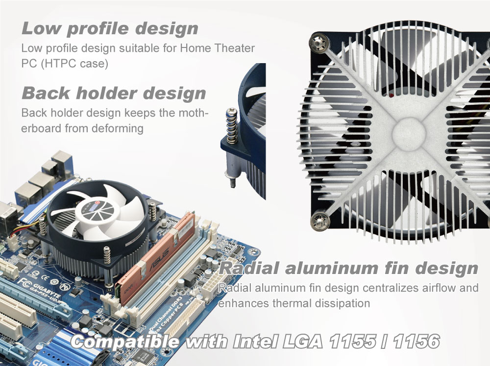 EinzelheitenIntel LGA 1155/1156/1200- Low-Profile-Design-CPU-Luftkühler mit Aluminiumkühlrippen / TDP 95W