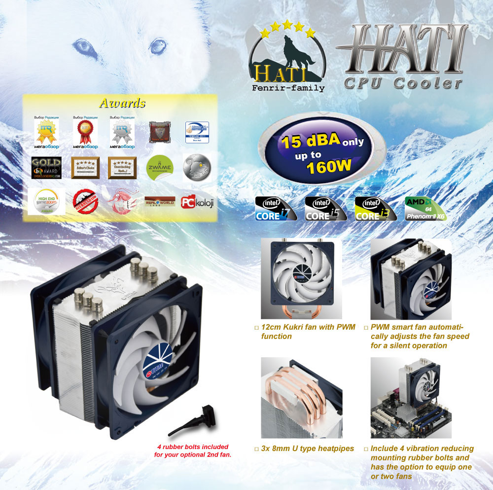 Hati, a super wolf of CPU cooler, features with 3 optimized u-shaped direct contact heat pipes and a 120mm low noise cooling fan with PWM function. It is able to accelerate heat dissipation by maximizing airflow and provide intelligent balanced customized speed and cooling performance.