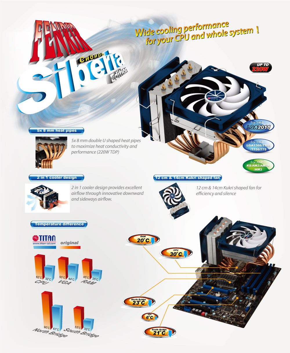 Con 5 tubos de calor de contacto directo de cobre en forma de U, equipados con el diseño especial de contacto de TITAN, este enfriador puede maximizar la transferencia de calor. - Super silencioso ventilador de CPU para operación silenciosa