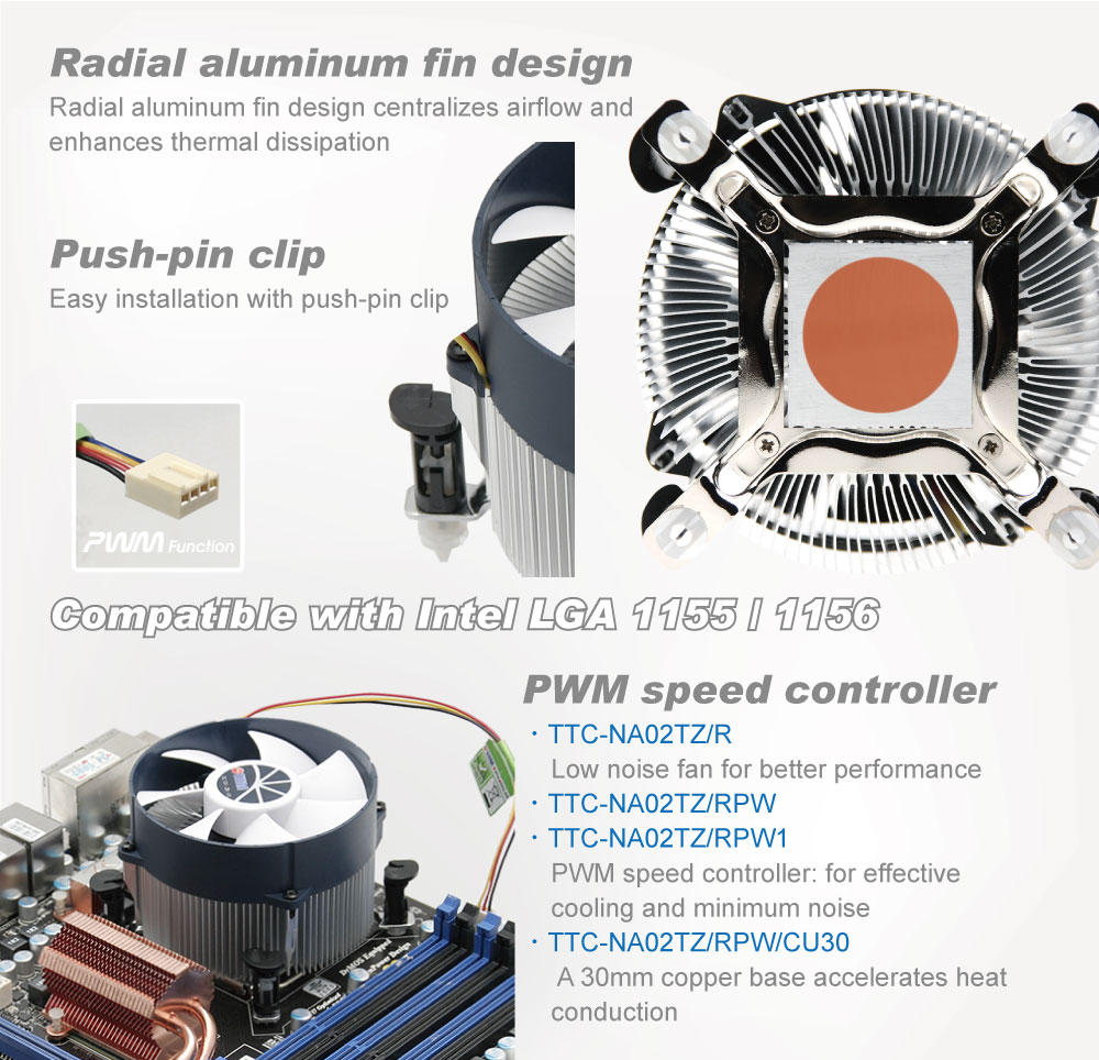 - TTC-NA02TZ/R:熱を効果的に放散するための静音冷却ファン TTC-NA02TZ/RPW:優れたバランスの取れたノイズと冷却性能のためのインテリジェントPWMコントローラー。